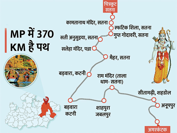 भगवान राम चित्रकूट में रहे थे, यहां पर वाल्मीकि आश्रम, मांडव्य आश्रम, भरत कूप आदि हैं। चित्रकूट में श्रीराम भ्रमण के कई प्रमाणिक स्थान हैं। रामचरित मानस में इस बात का वर्णन है कि यहां राम को मनाने के लिए भरत अपनी सेना के साथ पहुंचे थे। यहीं से वह राम की चरण पादुका लेकर लौटे। यहां राम साढ़े ग्यारह साल रहे। इसके बाद सतना, पन्ना, शहडोल, जबलपुर, विदिशा के वन क्षेत्रों से होते हुए वह दंडकारण्य चले गए। जबलपुर, शहडोल होते हुए राम अमरकंटक भी गए थे, जहां से वे छत्तीसगढ़ चले गए थे। चित्रकूट से अमरकंटक के बीच 10 स्थानों की विकास योजनाओं में तीर्थयात्रियों के लिए धर्मशालाओं का निर्माण करना भी विकास कामों में शामिल है।