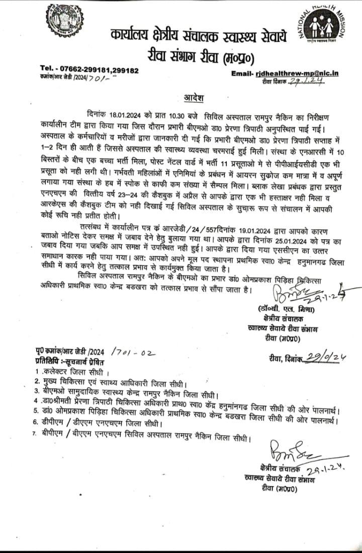 समाधान कारक नही पाया गया। अतः आपको अपने मूल पद स्थापना प्रथमिक स्वा० केन्द्र हनुमानगढ जिला सीधी में कार्य करने हेतु तत्काल प्रभाव से कार्यमुक्त किया जाता है।