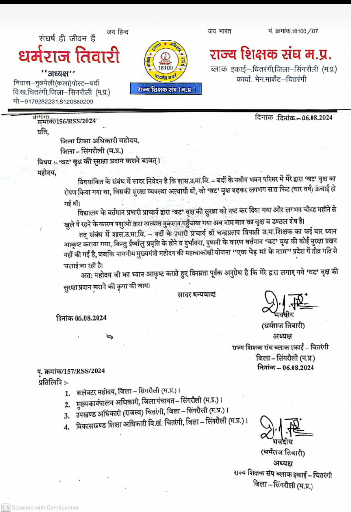 मंगल भारत. सिंगरौली. मध्य प्रदेश के राज्य शिक्षक संघ ब्लॉक इकाई चितरंगी अध्यक्ष धर्मराज तिवारी ने संकुल प्राचार्य वर्दी चंद्र प्रताप त्रिपाठी के ऊपर आरोप लगाते हुए जिला शिक्षा अधिकारी सिंगरौली, जिला कलेक्टर सिंगरौली, मुख्य कार्यपालन अधिकारी जिला पंचायत सिंगरौली, विकासखंड अधिकारी चितरंगी जिला सिंगरौली को आवेदन पत्र देकर ध्यान आकर्षित कराया गया कि वर्तमान प्रचार शासकीय उच्चतर माध्यमिक विद्यालय वर्दी में पदस्थ है.