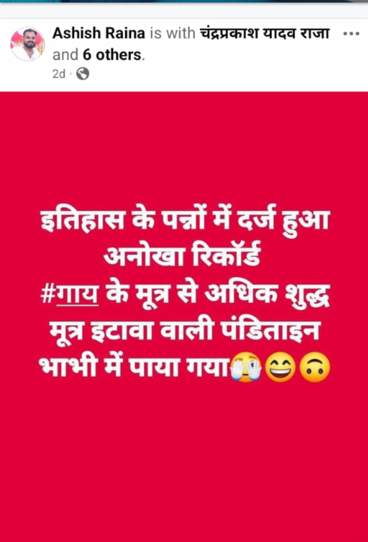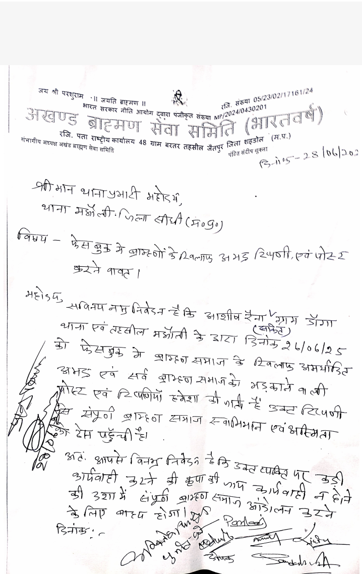 लेकिन वही मध्य प्रदेश के सीधी जिले के मझौली विकासखंड अंतर्गत ग्राम पंचायत डागा निवासी आशीष रैना साकेत द्वारा सोशल मीडिया में फेसबुक के माध्यम से संपूर्ण ब्राह्मण समाज को अभद्र टिप्पणियां की जा रही है.