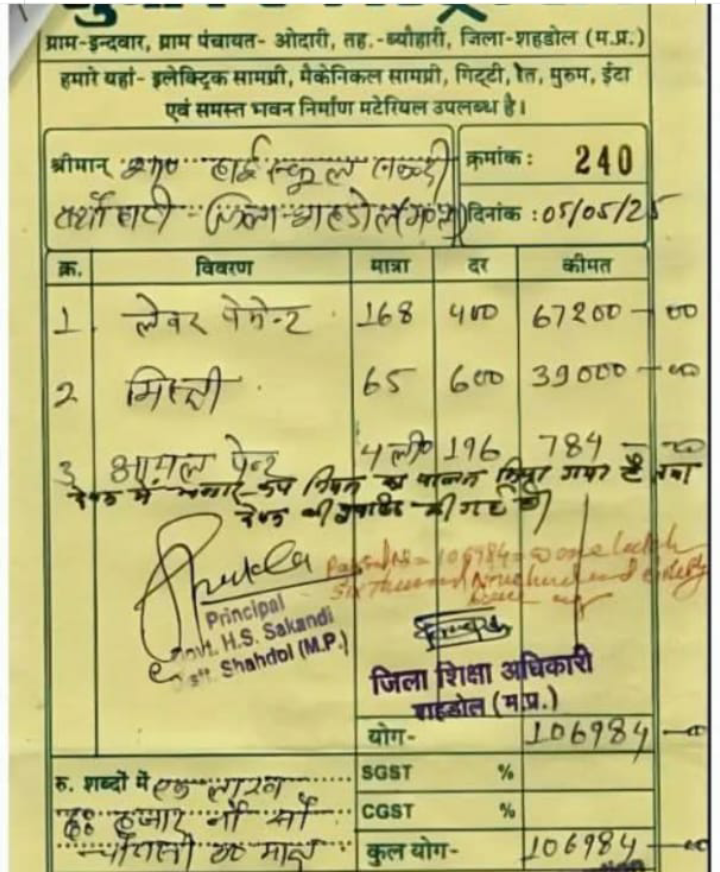 यह बिल शासकीय हाईस्कूल सकंदी (शहडोल) का है, जिसमें साफ़ तौर पर देखा जा सकता है कि—