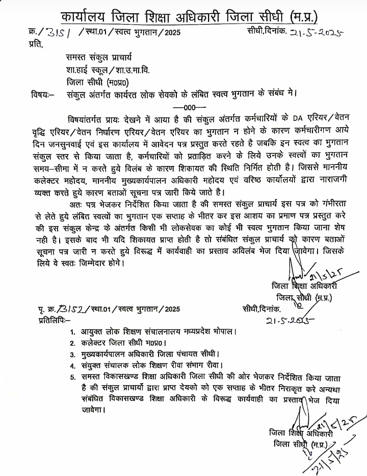 जिला शिक्षा अधिकारी, सीधी द्वारा जारी आदेश (क्रमांक 315 / स्वत्व भुगतान / 2025 दिनांक 21.5.2025) में इस बात का स्पष्ट उल्लेख है कि संकुल प्राचार्य के माध्यम से आए आवेदन बार-बार लंबित रखे जा रहे हैं। शिक्षकों से लेन-देन कर भुगतान की फाइलें आगे बढ़ाई जाती हैं, जिससे विद्यालयों में नाराजगी और अशांति का माहौल बना रहता है।