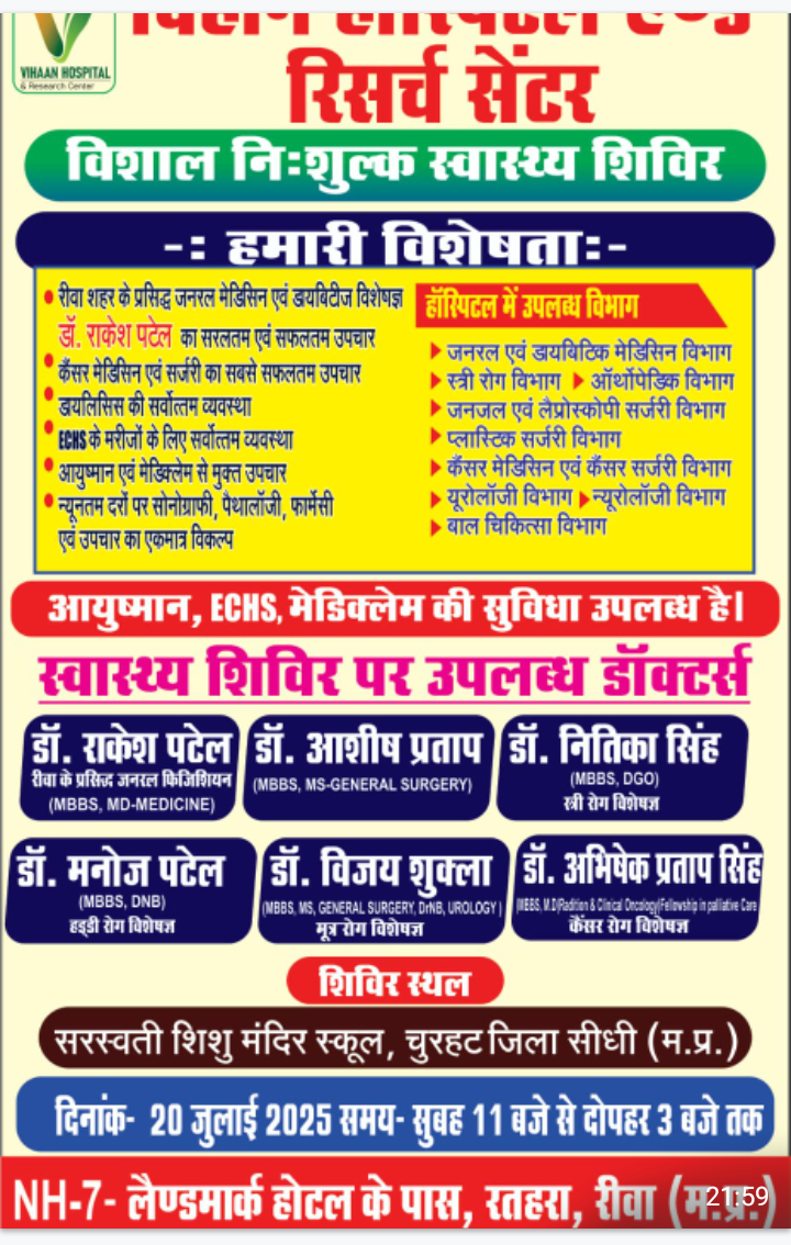 20 जुलाई 2025, रविवार को यहां विहान हॉस्पिटल एंड रिसर्च सेंटर, रीवा द्वारा एक विशाल नि:शुल्क स्वास्थ्य शिविर का आयोजन किया जा रहा है।