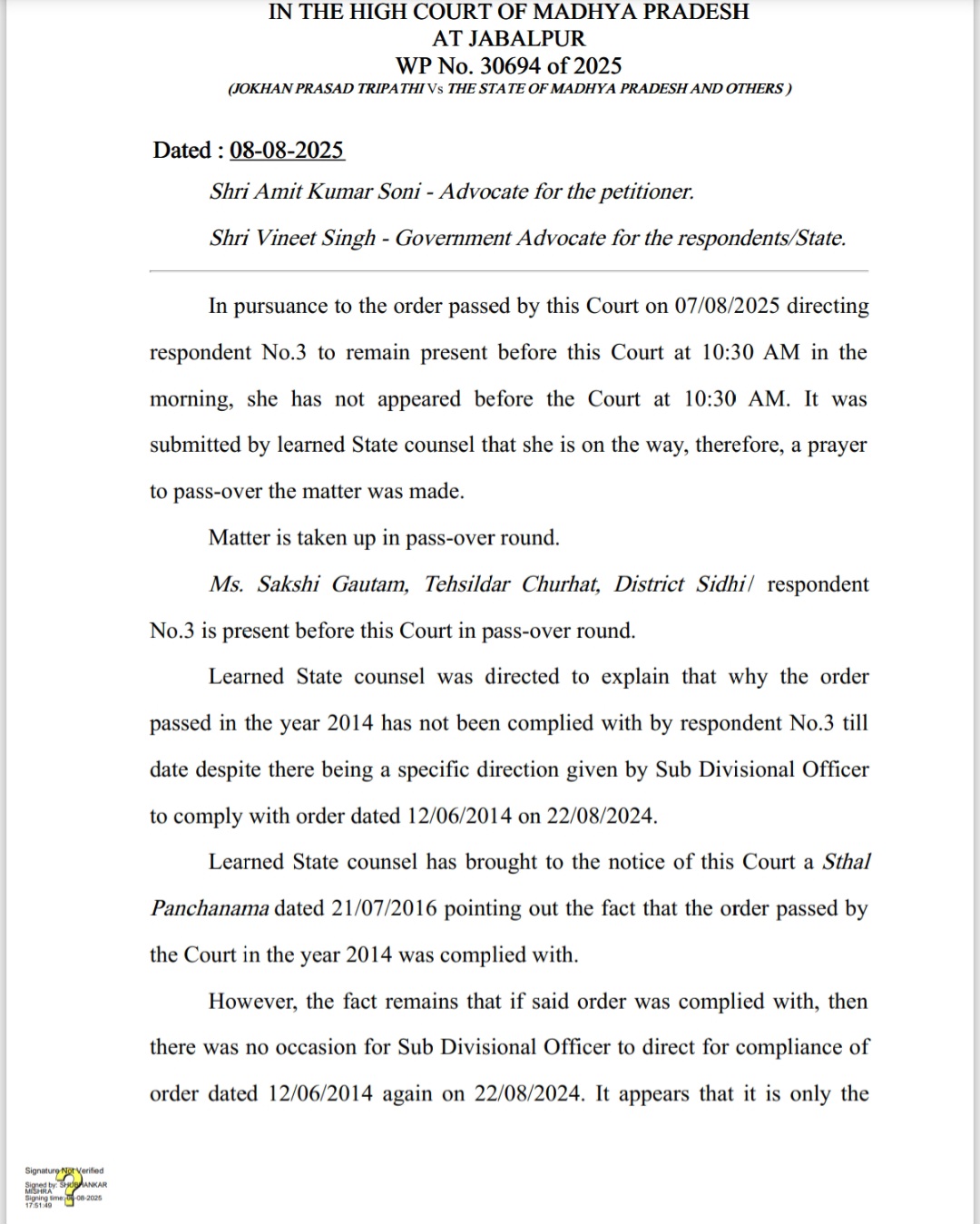 6 अगस्त 2025 को हुई सुनवाई में, अधिवक्ता अमित कुमार सोनी ने कोर्ट का ध्यान इस ओर दिलाया कि निजी प्रतिवादियों के खिलाफ सिविल जेल की कार्यवाही भी शुरू की जा चुकी है, लेकिन प्रशासन ने कार्रवाई पूरी नहीं की। उन्होंने यह भी बताया कि 22 अगस्त 2024 को चुरहट के एसडीओ ने तहसीलदार को आदेश का पालन करने के निर्देश दिए थे, लेकिन जमीनी स्तर पर कुछ नहीं हुआ।