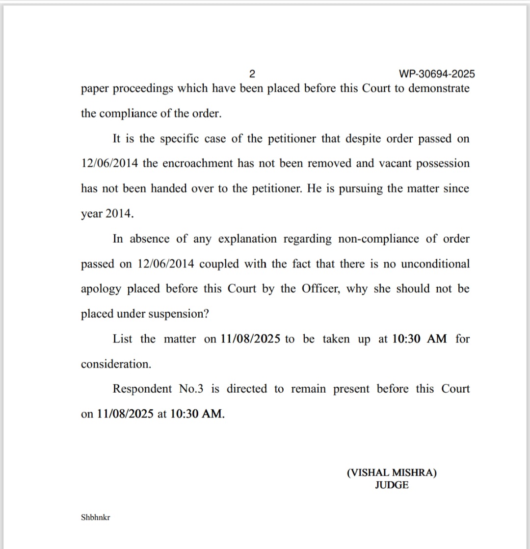 7 अगस्त को कोर्ट ने हैरानी जताई कि 2014 का आदेश आज तक अधूरा क्यों है और प्रतिवादी क्रमांक-3 को 8 अगस्त को पेश होने का आदेश दिया।