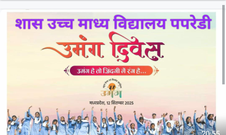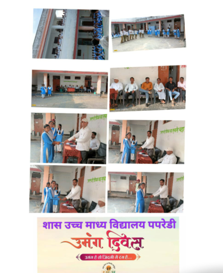 जिसके अंतर्गत शहडोल जिले के व्यवहारी विकासखंड अंतर्गत शासकीय उच्चतर माध्यमिक विद्यालय पपरेडी में उमंग दिवस पर उमंग कार्यक्रम का आयोजन किया गया जिसमे विद्यालय के प्रभारी प्राचार्य बिजेंद्र राठौर के सानिध्य मे कार्यक्रम किया गया कार्यक्रम का मंच संचालन गौरव पयासी के द्वारा किया गया.