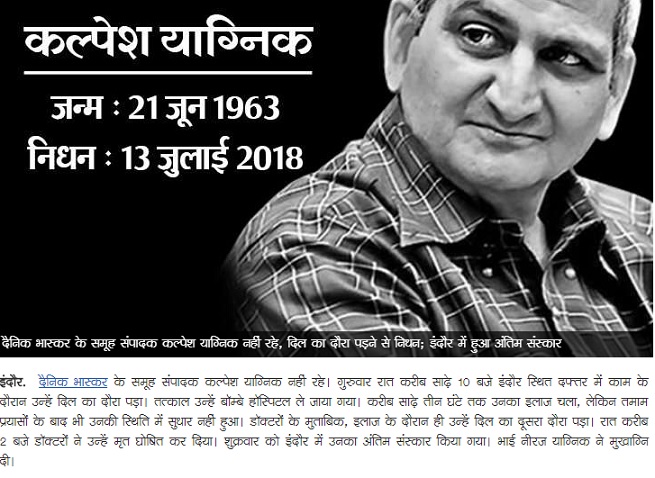 दैनिक भास्कर की ओर से कहा गया कि इंदौर कार्यालय में रात साढ़े दस बजे कल्पेश याग्निक को दिल का दौरा पड़ा। उन्हें इलाज के लिए बाम्बे अस्पताल में भर्ती कराया गया लेकिन बचाया नहीं जा सका। यही बात पूरी मीडिया ने छापी।