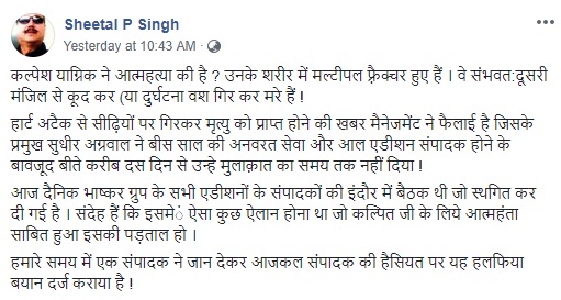 बहरहाल, अब यह साफ़ हो गया है कि शीतल सिंहं की सूचना पुरी तरह सही थी। भास्कर ग्रुप ने ख़ुदकुशी की ख़बर को छिपाने और इसे दिल का दौरा पड़ने से हुई मौत बताने में पूरी ताक़त झोंक दी, लेकिन तमाम सबूतों को देखते हुए पुलिस को कहना ही पड़ा कि कल्पेश याज्ञ्निक ने आत्महत्या की है।